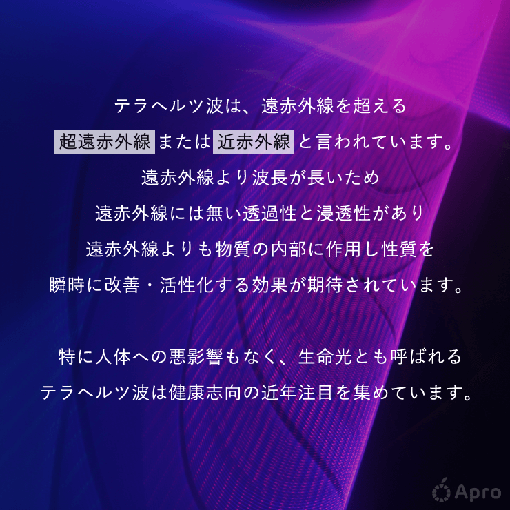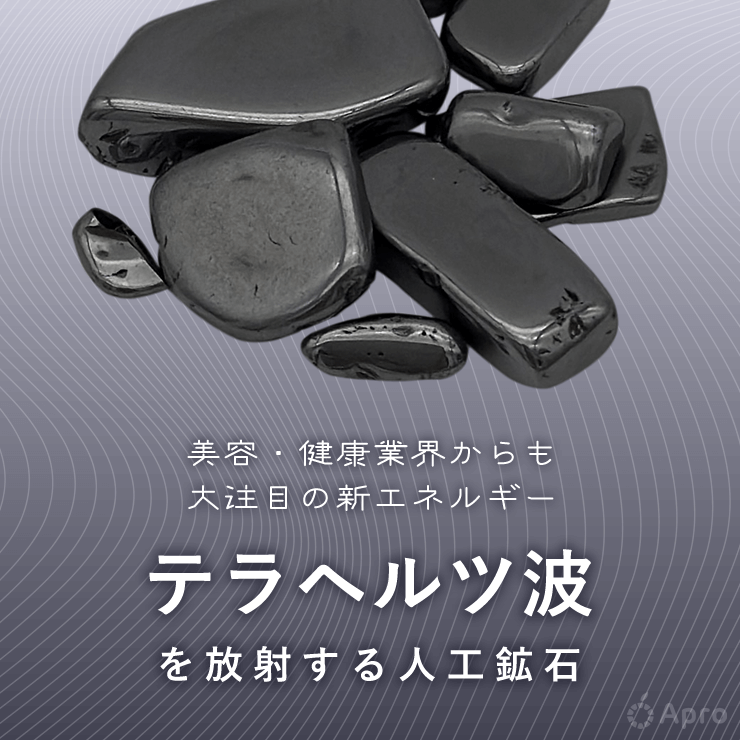 《テラヘルツ鉱石》 テラヘルツ鉱石とは、美容業界、健康グッズ業界、パワーストーン業界で注目されている新エネルギー、テラヘルツ波を放射する人工鉱石です。 1秒間に1兆回もの分子振動が起こる事から、テラ(1兆回1TERA)ヘルツ波(周波数)つまりテラヘルツ波と言われています。 そのテラヘルツ波の周波数は、1兆Hz〜100兆Hzの間で、波長は3μm〜1000μmという光と電波の両方の性質を併せ持っています。