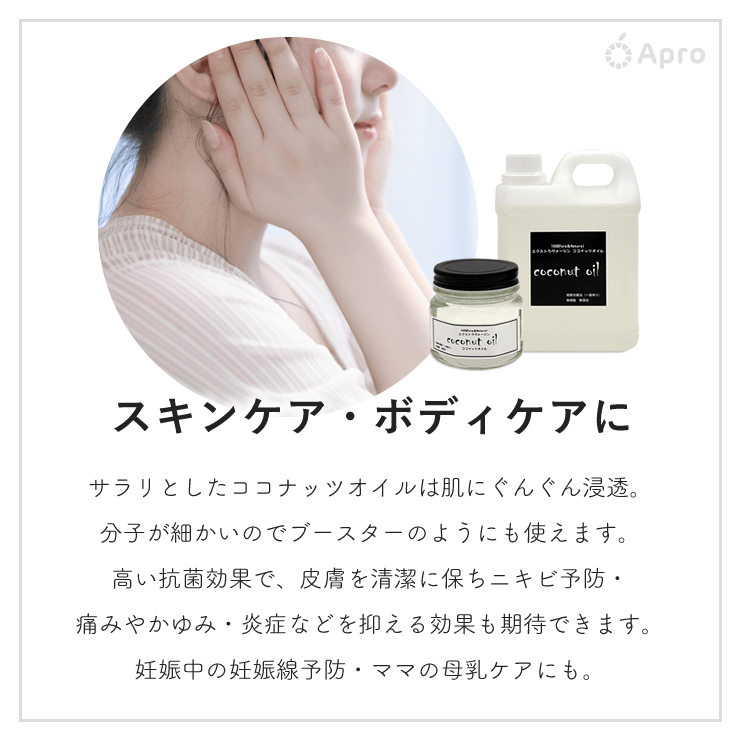 保湿効果に優れ、肌の潤い保つとともに皮膚の血流や代謝も高めます。高い抗菌効果で、皮膚を清潔に保ちニキビ予防・痛みやかゆみ・炎症などを抑える効果も期待できます。妊娠中の妊娠線予防・ママの母乳ケアなど