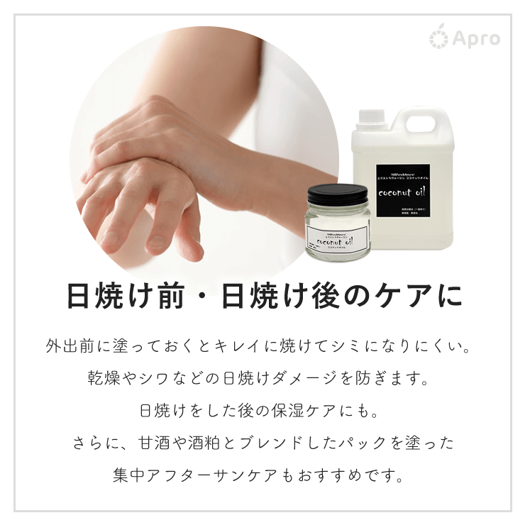 ココナッツオイルは他のオイルよりもサラリとして肌にぐんぐん浸透。分子が細かいのでブースターのようにも使えます。洗いたての肌に塗ると化粧水などのなじみがとてもよくなります。ドライヤー後、適量を毛先などに塗る。
