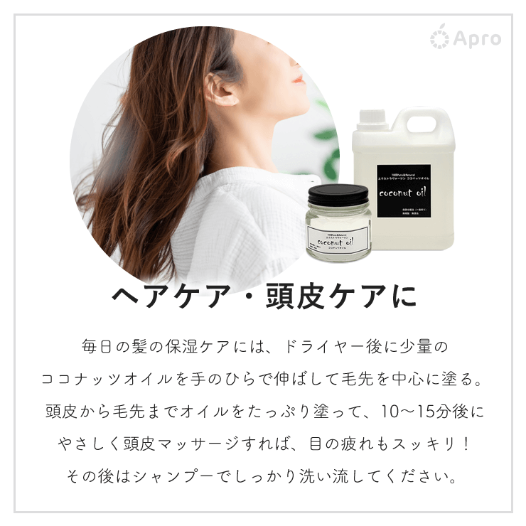 パサついたダメージヘアーが柔らかくよみがえる。頭皮から毛先までココナッツオイルをたっぷり塗り10〜15分置く。その間、触れるか触れないかの力加減で頭皮マッサージをすると、目の疲れもスッキリ!!10〜15分後シャンプーでしっかり洗い流せば生まれたてのような柔らかい手触りに・・・抜け毛を防ぎ、育毛を促す。