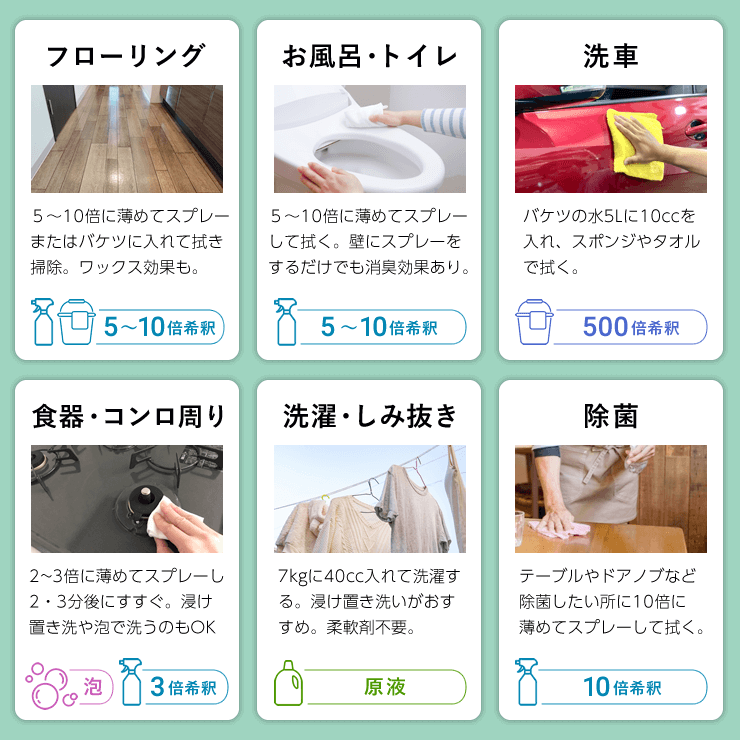 洗浄力は高く、お掃除にはもちろん、あらゆる菌(ノロウイルスを含む菌類)を99.9%除菌し、消臭力、抗カビ力、静電気防止に優れています。