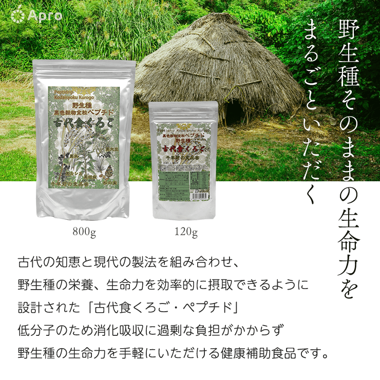 「古代食くろご・ペプチド」の主原料は古代のままの品種である野生種の黒米を主としています。古代人が食べていた希少な野生種が気象学を応用した自然製法によって現代人にも吸収されやすい水溶性ペプチド粉末に進化しました。お湯か水に溶かして飲むだけで美味しく頂けますので、忙しい朝の朝食代わりや、体調を整える副食にもなります。溶かして飲む香ばしい飲み物ですので 「古代食くろご・ペプチド」を毎日ご愛飲いただけば野生種の強い生命情報を一日一度、体に摂り入れることができます。心身とも野生の生命力を取り戻す飲み物です。