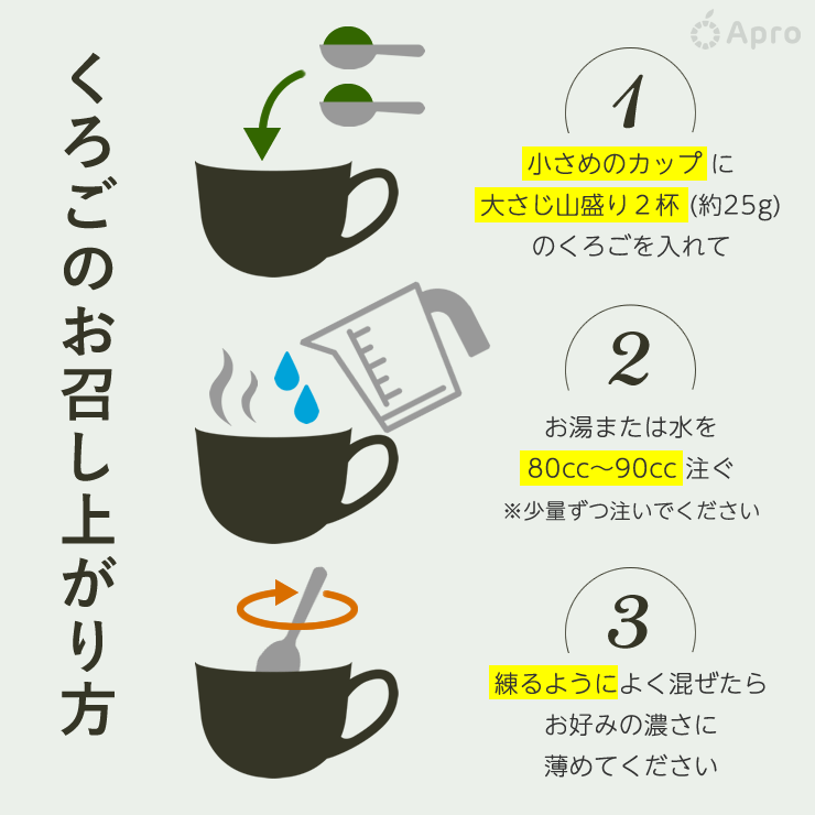 小さめのカップを用い目安として大さじ山盛り 2 杯(約 25g)を 80〜90 佞療鬚水でよく撹拌してお飲みください。