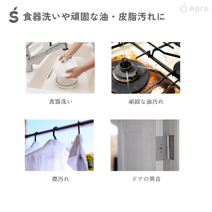 食器洗いやしつこい油汚れには、洗浄力の高い96%タイプ。肌にやさしい天然成分なので、手が荒れにくく、お子様やペットのいるご家庭でも安心です。キッチンでの作業はもちろん、お洗濯、家や家電のお掃除など幅広くお使いいただけます。
