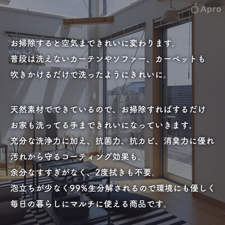 普段は洗えないカーテンやソファー、カーペットも吹きかけるだけで洗ったようにきれいに。