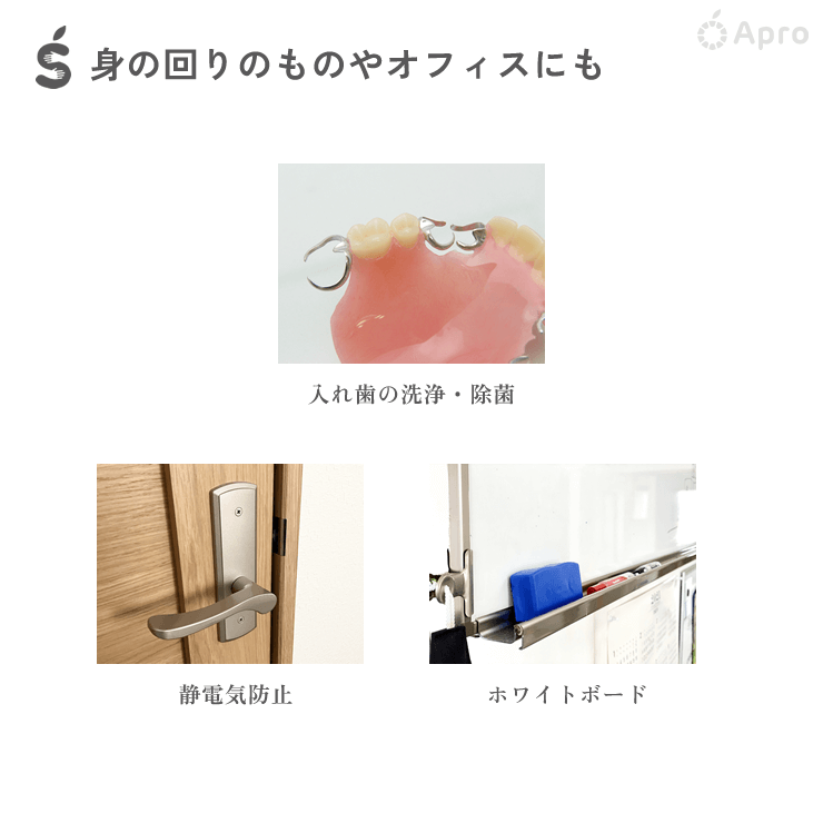 リビング、キッチン、床、トイレ、玄関、電子レンジ、カーテン、ソファ、カーペット、エアコン、加湿器、空気清浄機洗浄、赤ちゃんの身の回りのお掃除、おもちゃ洗浄、ペット用具、ペットのトイレなど家中のありとあらゆるお掃除に使用できます。