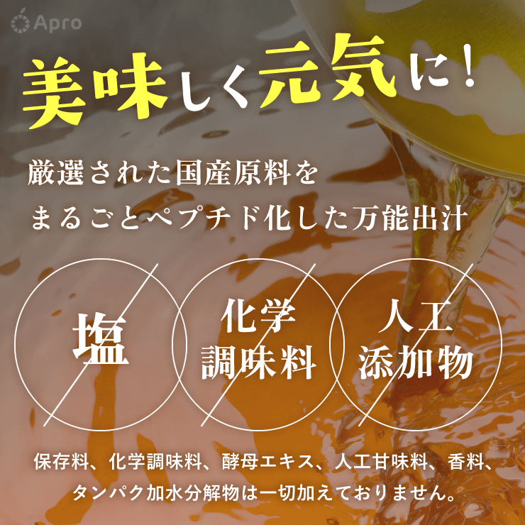 いわし、カツオ、昆布、原木椎茸、無臭にんにくの厳選された自然素材を不自然な化学溶剤などを使わず自然製法で分子の細かいペプチドにしています。