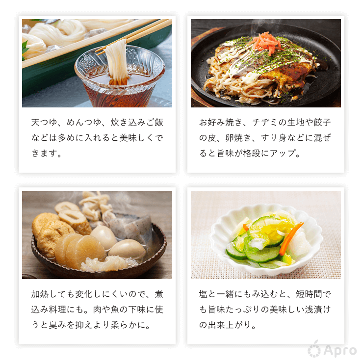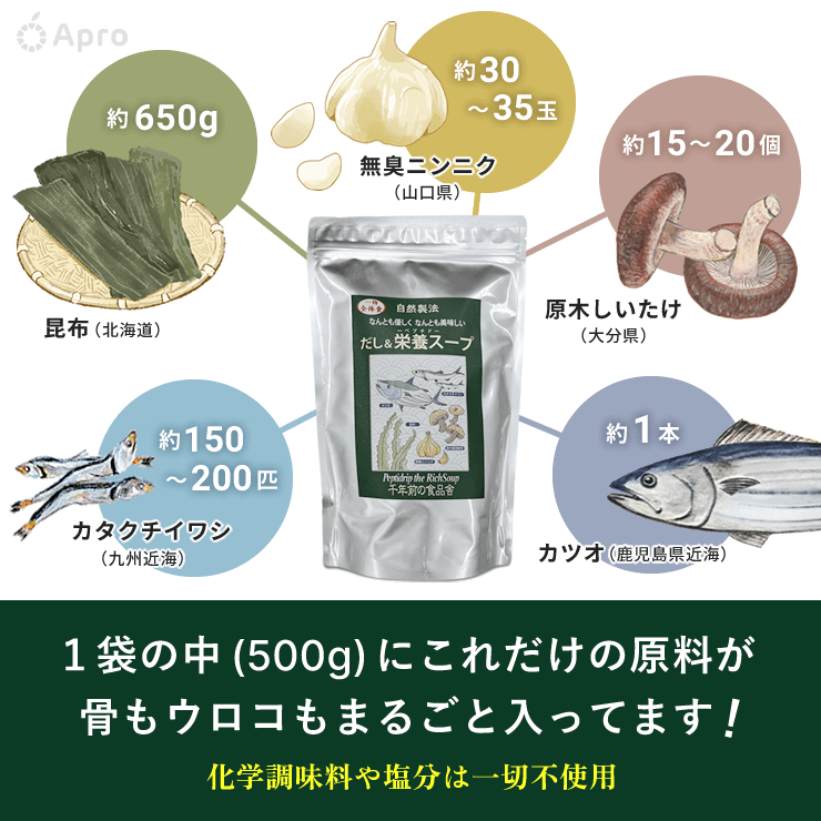 澱粉分解物(キャッサバ芋・タイ)カタクチイワシ(福岡・長崎県近海)カツオ(鹿児島県近海)昆布(北海道) 原木栽培椎茸(大分県)無臭ニンニク(山口県)