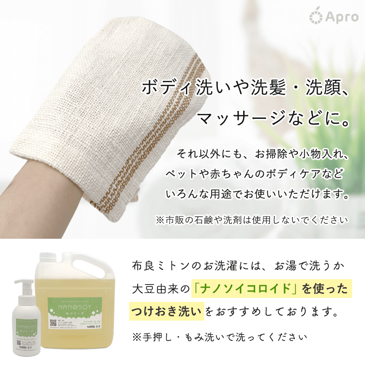 布良のタオル生地で手袋状になっていて、中に手を入れてボディや洗髪・洗顔・マッサージなどにお使いいただけます