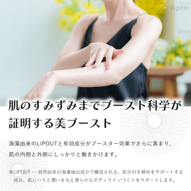 ※LIPOUTとは、自然由来の海藻抽出成分で構成される、肌の引き締めをサポートする成分です。肌にハリと潤いを与え、滑らかなボディラインづくりをサポートします。